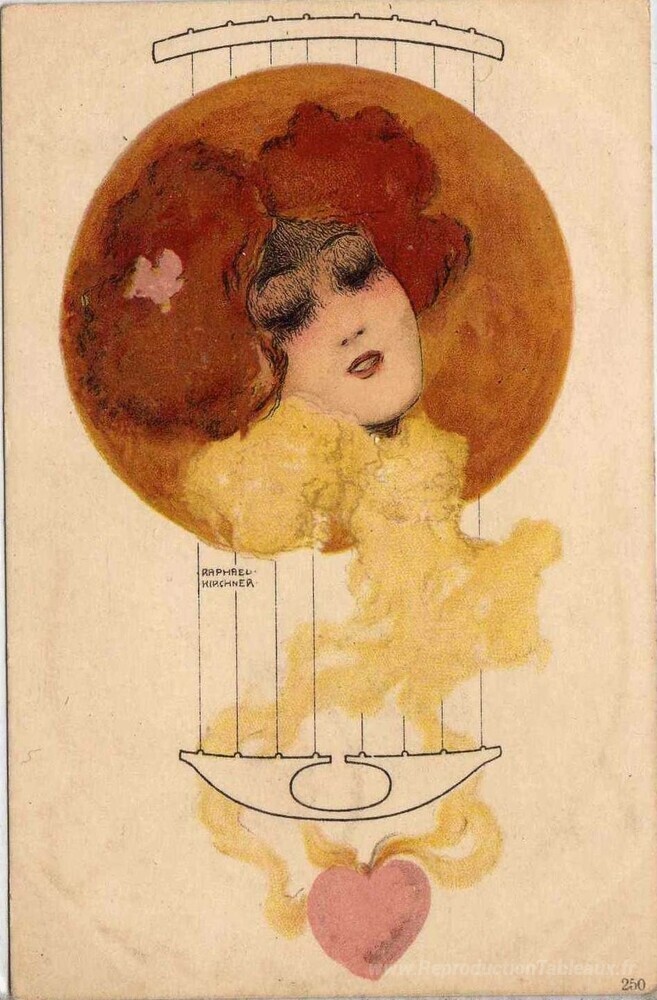 Nous vous proposons une reproduction artisanale sur toile du célèbre tableau 'Les filles têtes en cercle' de Raphael Kirchner, provenant du Musée de la Reproduction.