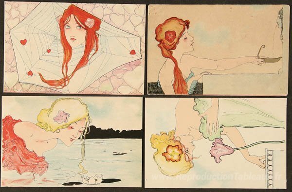 Nous vous proposons une reproduction artisanale sur toile du célèbre tableau 'Les pensées d'amour' de Raphael Kirchner, provenant du Musée de la Reproduction.