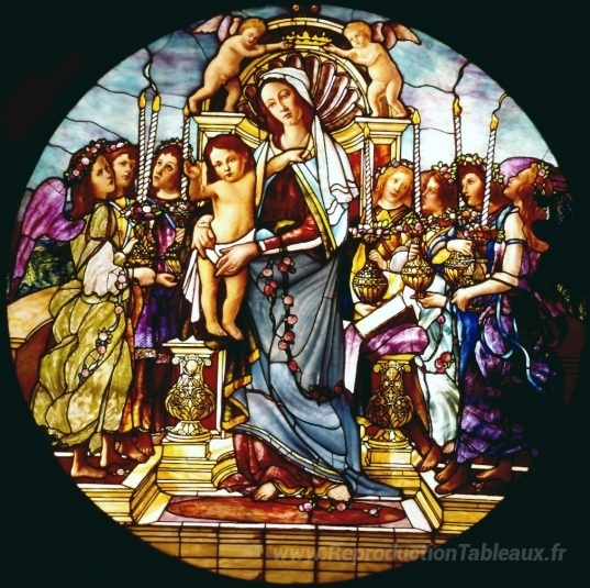 Nous vous proposons une reproduction artisanale sur toile du célèbre tableau 'Madonna et fenêtre d'enfant' de Louis Comfort Tiffany, provenant du Musée de la Reproduction.