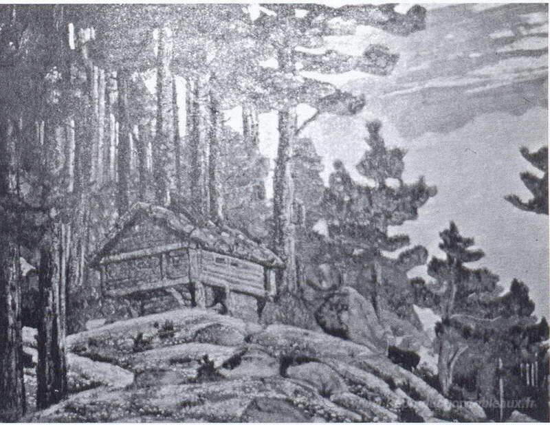 Nous vous proposons une reproduction artisanale sur toile du célèbre tableau 'Maisons dans la forêt' de Nicholas Roerich, provenant du Musée de la Reproduction.