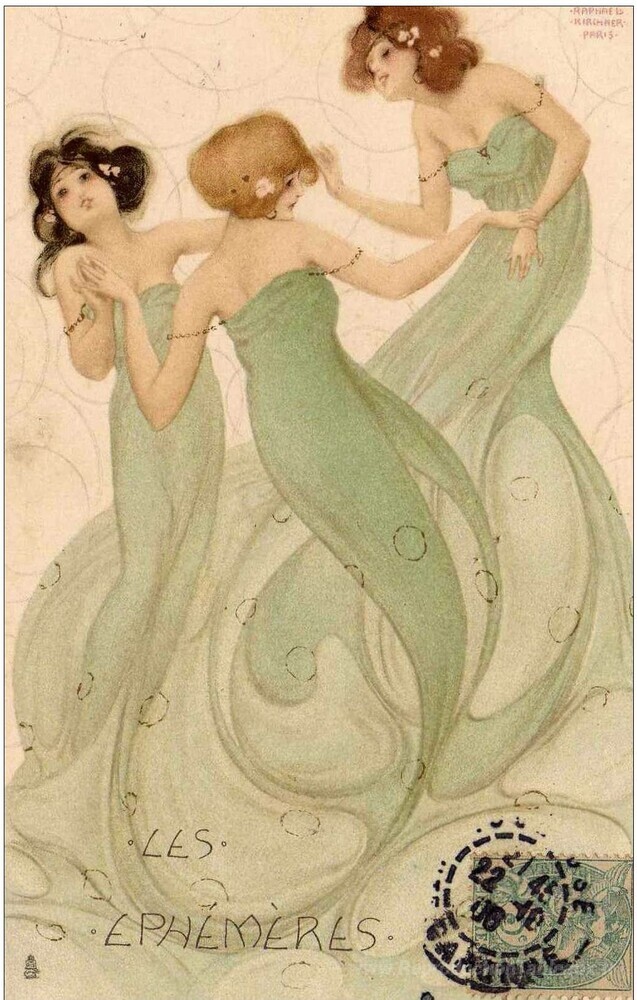 Nous vous proposons une reproduction artisanale sur toile du célèbre tableau 'Mayflyes' de Raphael Kirchner, provenant du Musée de la Reproduction.