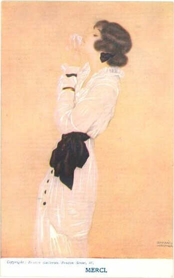 Nous vous proposons une reproduction artisanale sur toile du célèbre tableau 'Merci I' de Raphael Kirchner, provenant du Musée de la Reproduction.