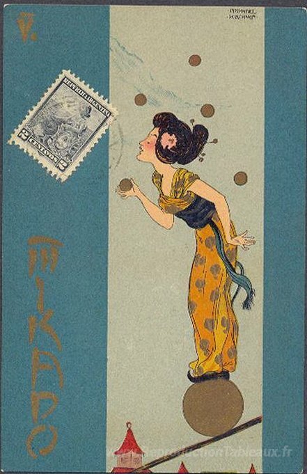 Nous vous proposons une reproduction artisanale sur toile du célèbre tableau 'Mikado' de Raphael Kirchner, provenant du Musée de la Reproduction.