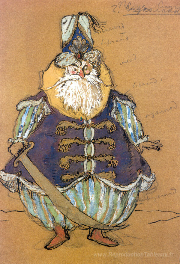 Nous vous proposons une reproduction artisanale sur toile du célèbre tableau 'Pacha. Conception de costumes pour le ballet de Tcherepnin "Le P' de Alexandre Benois, provenant du Musée de la Reproduction.