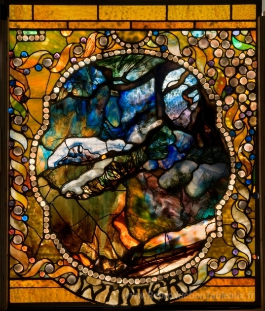 Nous vous proposons une reproduction artisanale sur toile du célèbre tableau 'Panneau d'hiver de la fenêtre Four Seasons' de Louis Comfort Tiffany, provenant du Musée de la Reproduction.