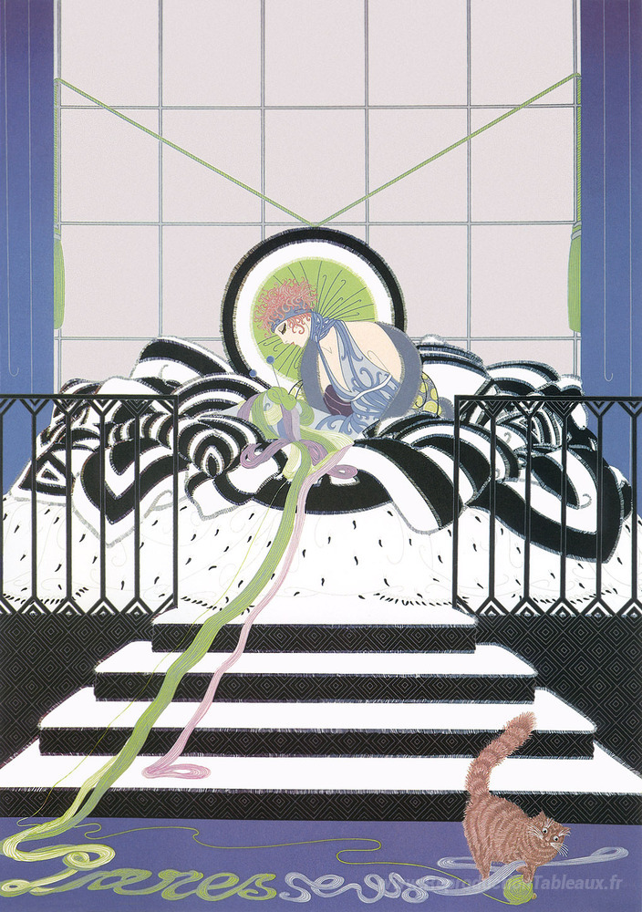 Nous vous proposons une reproduction artisanale sur toile du célèbre tableau 'Paresseuse' de Erte, provenant du Musée de la Reproduction.