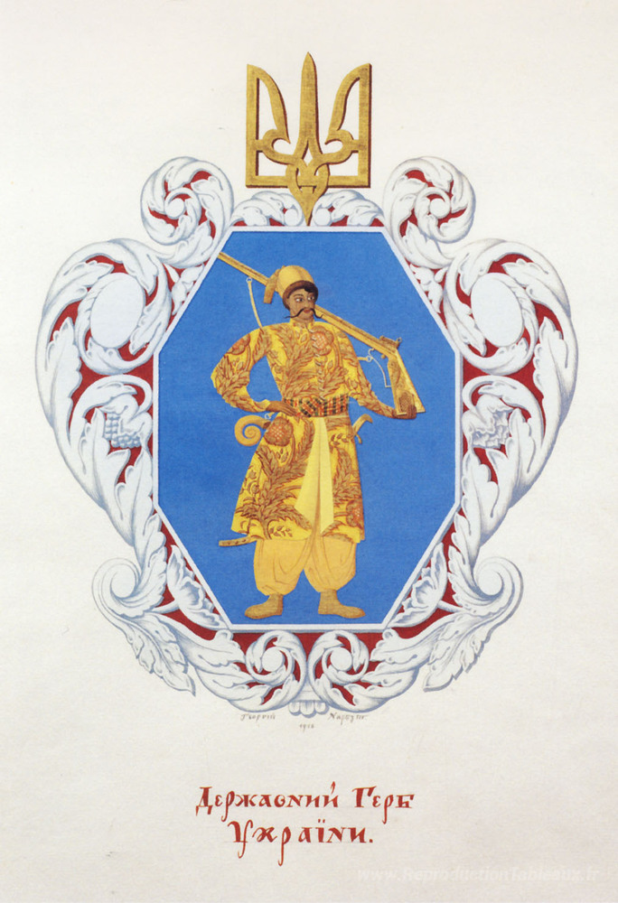 Nous vous proposons une reproduction artisanale sur toile du célèbre tableau 'Petits armoiries L'État ukrainien' de Heorhiy Narbut, provenant du Musée de la Reproduction.