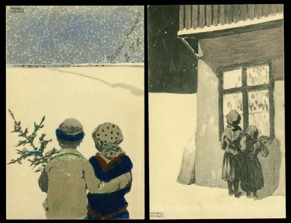 Nous vous proposons une reproduction artisanale sur toile du célèbre tableau 'Photos de Noël' de Raphael Kirchner, provenant du Musée de la Reproduction.