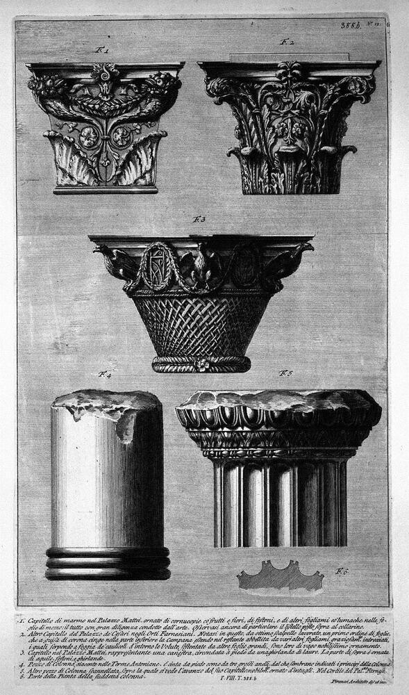 Nous vous proposons une reproduction artisanale sur toile du célèbre tableau 'Pièces de colonnes et de capitales' de Giovanni Battista Piranesi, provenant du Musée de la Reproduction.