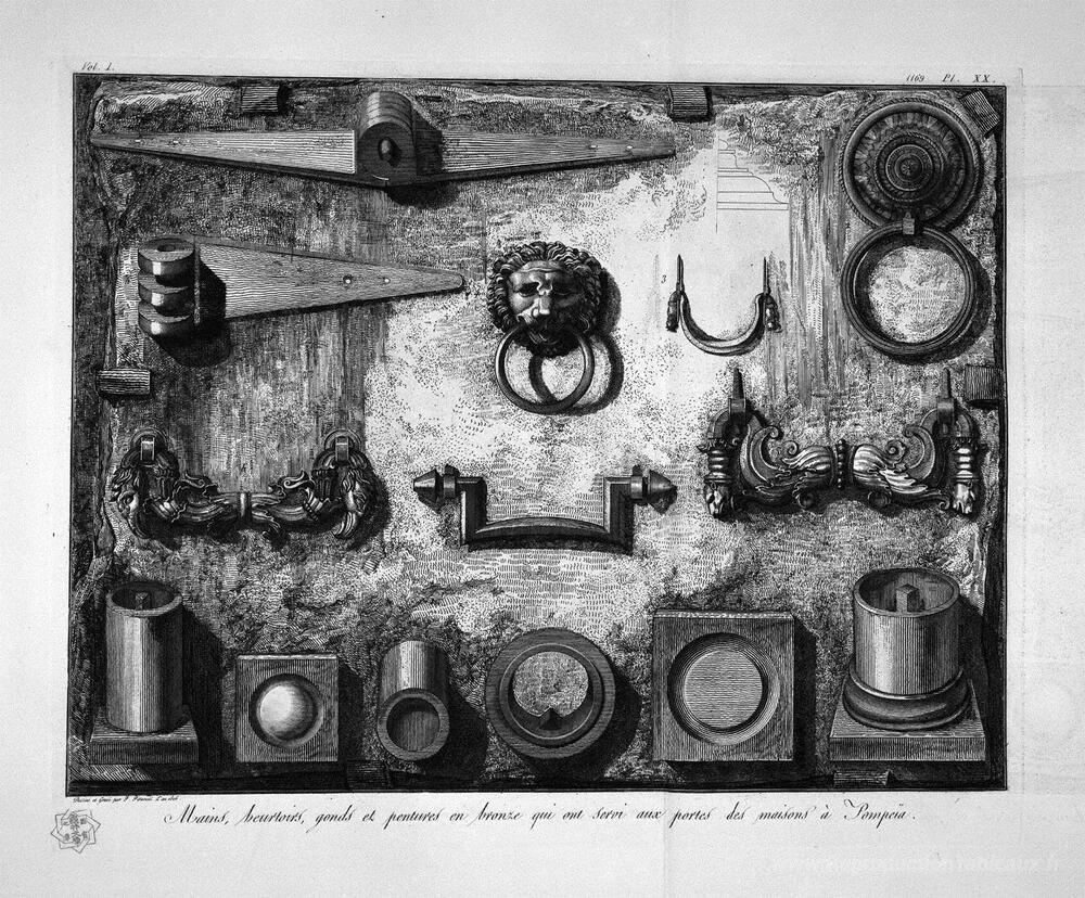 Nous vous proposons une reproduction artisanale sur toile du célèbre tableau 'Poignées, heurtants, charnières trouvées à Pompéi' de Giovanni Battista Piranesi, provenant du Musée de la Reproduction.