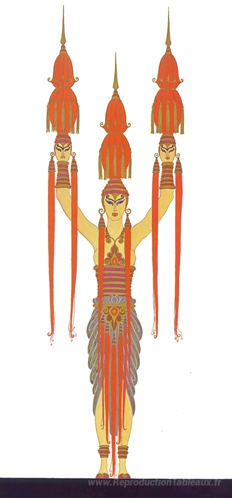 Nous vous proposons une reproduction artisanale sur toile du célèbre tableau 'Porteur de lanterne, trésors de l'Indochine' de Erte, provenant du Musée de la Reproduction.