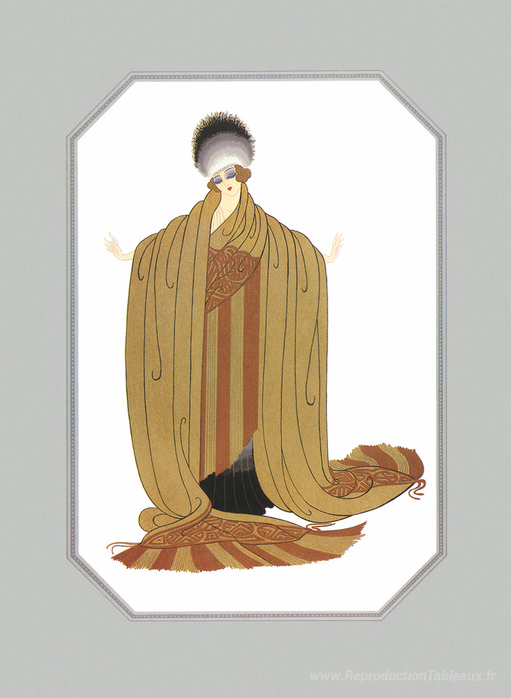 Chaque reproduction de Préféré du roi est soigneusement réalisée pour préserver les détails exquis et les nuances délicates de l’original, offrant ainsi une touche de sophistication à votre intérieur. Que ce soit dans un salon, un bureau ou une chambre, cette œuvre contribue à créer une atmosphère unique, reflet de votre goût prononcé pour l'art. Laissez-vous séduire par la magie d’Erte et sublimez votre décoration avec une œuvre qui transcende le temps.