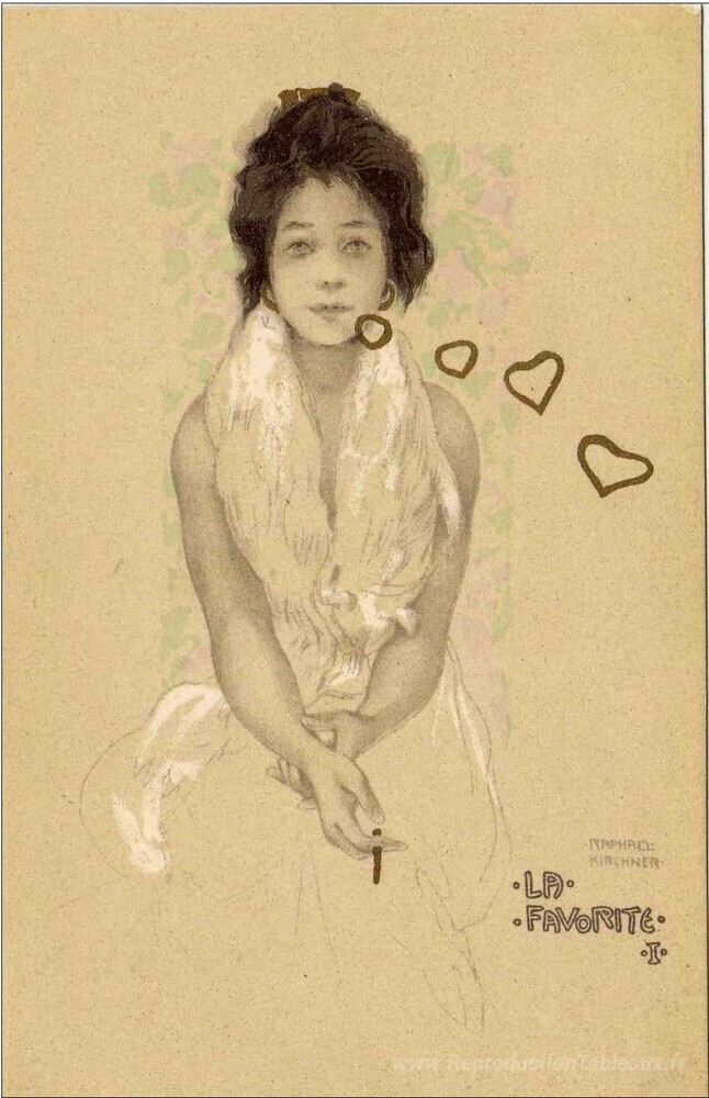 Nous vous proposons une reproduction artisanale sur toile du célèbre tableau 'Préféré' de Raphael Kirchner, provenant du Musée de la Reproduction.