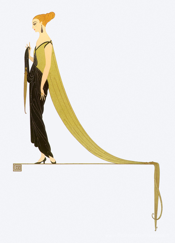 Nous vous proposons une reproduction artisanale sur toile du célèbre tableau 'Prêt pour la balle 2' de Erte, provenant du Musée de la Reproduction.