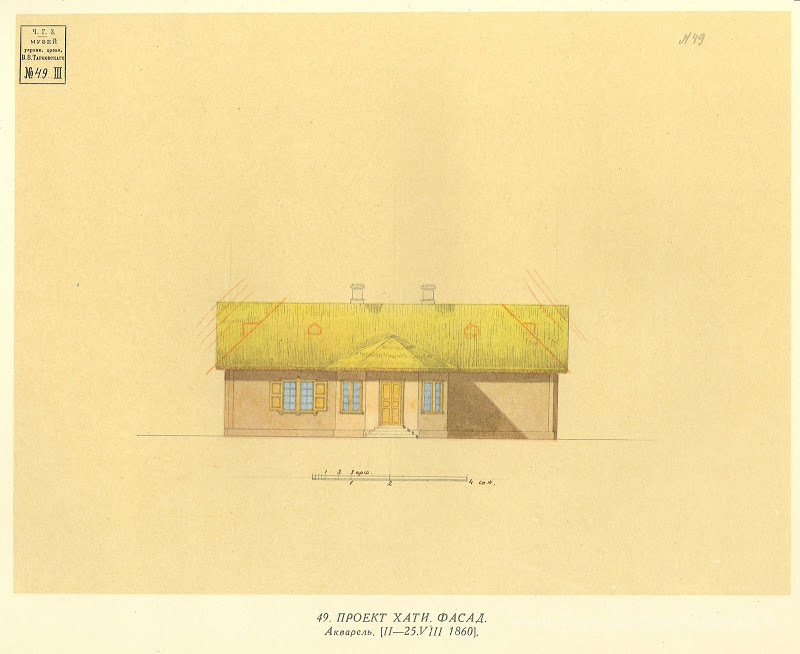 Nous vous proposons une reproduction artisanale sur toile du célèbre tableau 'Projet architectural de la maison privée. Façade principale.' de Taras Shevchenko, provenant du Musée de la Reproduction.