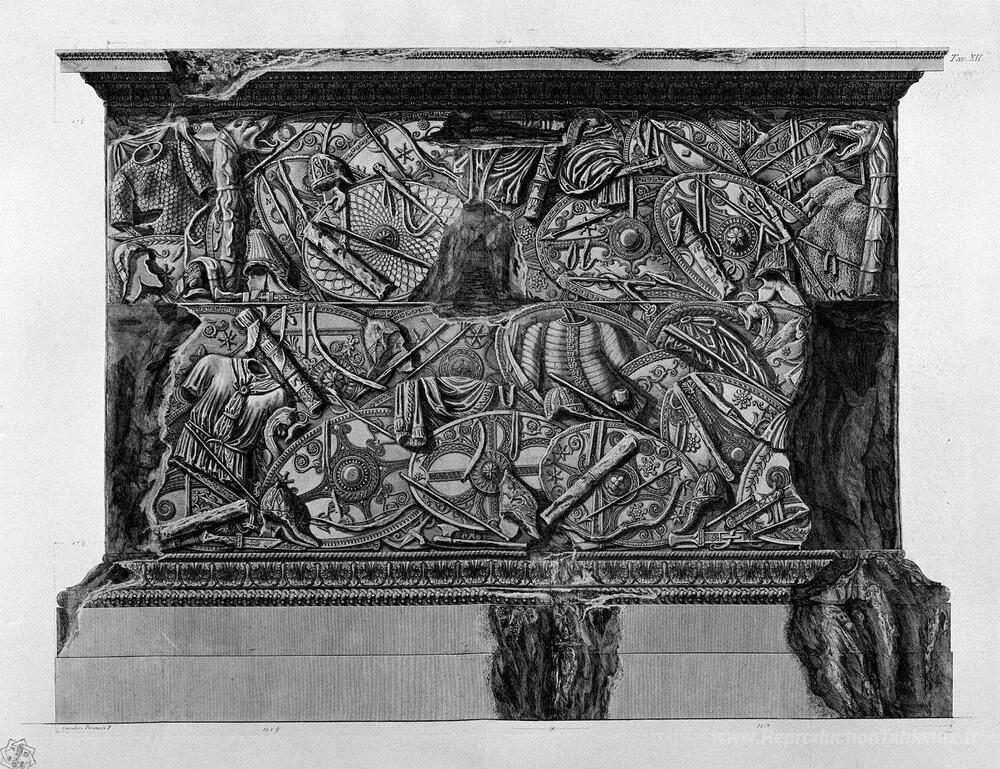 Nous vous proposons une reproduction artisanale sur toile du célèbre tableau 'Quatrième côté du piédestal de la même colonne' de Giovanni Battista Piranesi, provenant du Musée de la Reproduction.