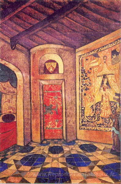 Nous vous proposons une reproduction artisanale sur toile du célèbre tableau 'Salle de la reine Anna' de Nicholas Roerich, provenant du Musée de la Reproduction.