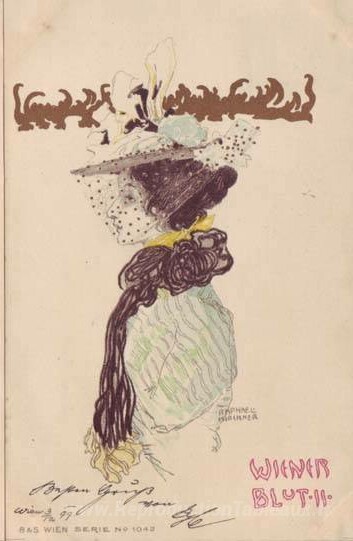 Nous vous proposons une reproduction artisanale sur toile du célèbre tableau 'Sang viennois' de Raphael Kirchner, provenant du Musée de la Reproduction.