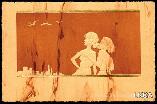 Nous vous proposons une reproduction artisanale sur toile du célèbre tableau 'Sculpture ivoire' de Raphael Kirchner, provenant du Musée de la Reproduction.