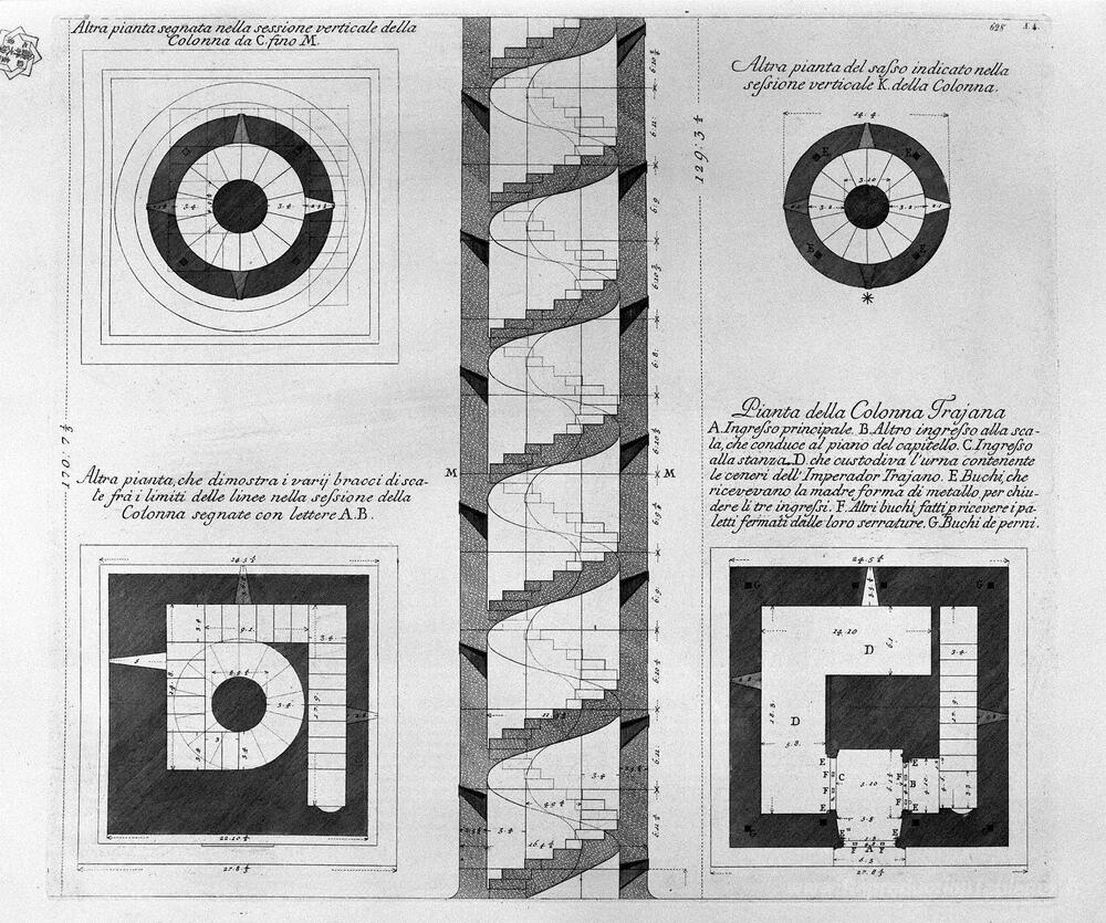 Nous vous proposons une reproduction artisanale sur toile du célèbre tableau 'Section verticale de la colonne Trajan, avec six plantes prises ' de Giovanni Battista Piranesi, provenant du Musée de la Reproduction.