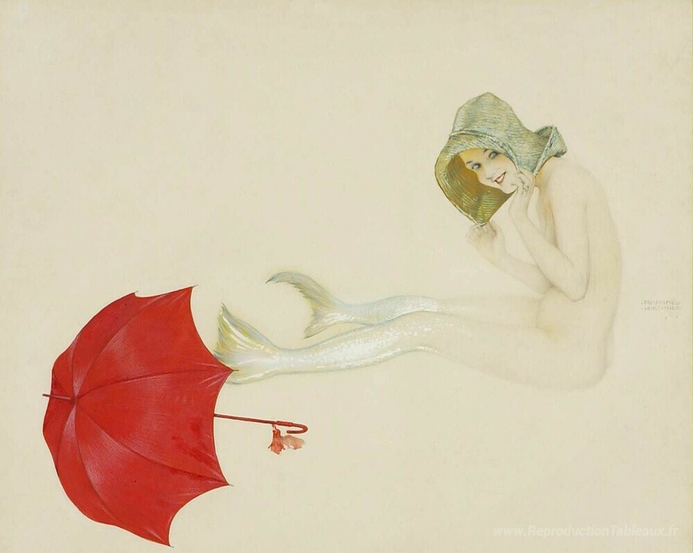 Nous vous proposons une reproduction artisanale sur toile du célèbre tableau 'Sirène' de Raphael Kirchner, provenant du Musée de la Reproduction.