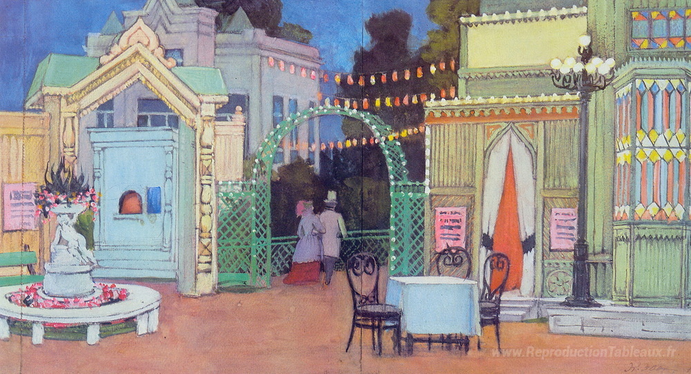 Nous vous proposons une reproduction artisanale sur toile du célèbre tableau 'Sketch pour la pièce par Ostrovsky «Mad Money». Dans le parc Pet' de Konstantin Yuon, provenant du Musée de la Reproduction.