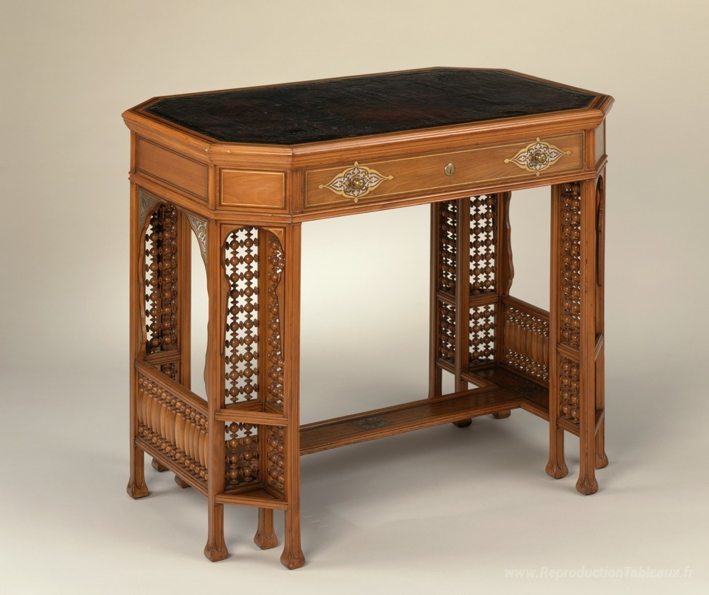 Nous vous proposons une reproduction artisanale sur toile du célèbre tableau 'Table d'écriture de la résidence Henry G. Marquand' de Louis Comfort Tiffany, provenant du Musée de la Reproduction.