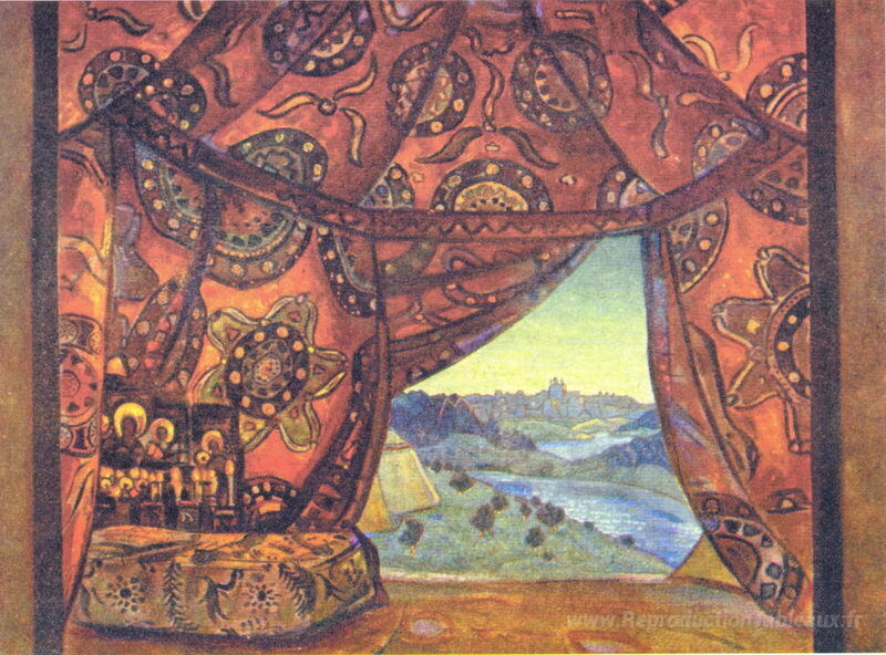 Nous vous proposons une reproduction artisanale sur toile du célèbre tableau 'Tente d'Ivan le terrible' de Nicholas Roerich, provenant du Musée de la Reproduction.