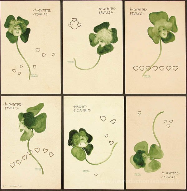 Nous vous proposons une reproduction artisanale sur toile du célèbre tableau 'Trèfles' de Raphael Kirchner, provenant du Musée de la Reproduction.