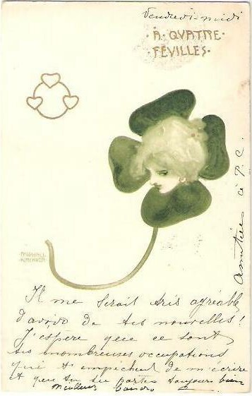 Nous vous proposons une reproduction artisanale sur toile du célèbre tableau 'Trèfles' de Raphael Kirchner, provenant du Musée de la Reproduction.