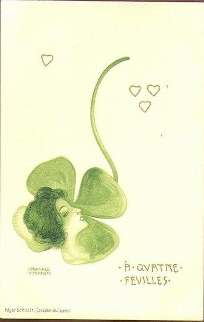 Nous vous proposons une reproduction artisanale sur toile du célèbre tableau 'Trèfles' de Raphael Kirchner, provenant du Musée de la Reproduction.