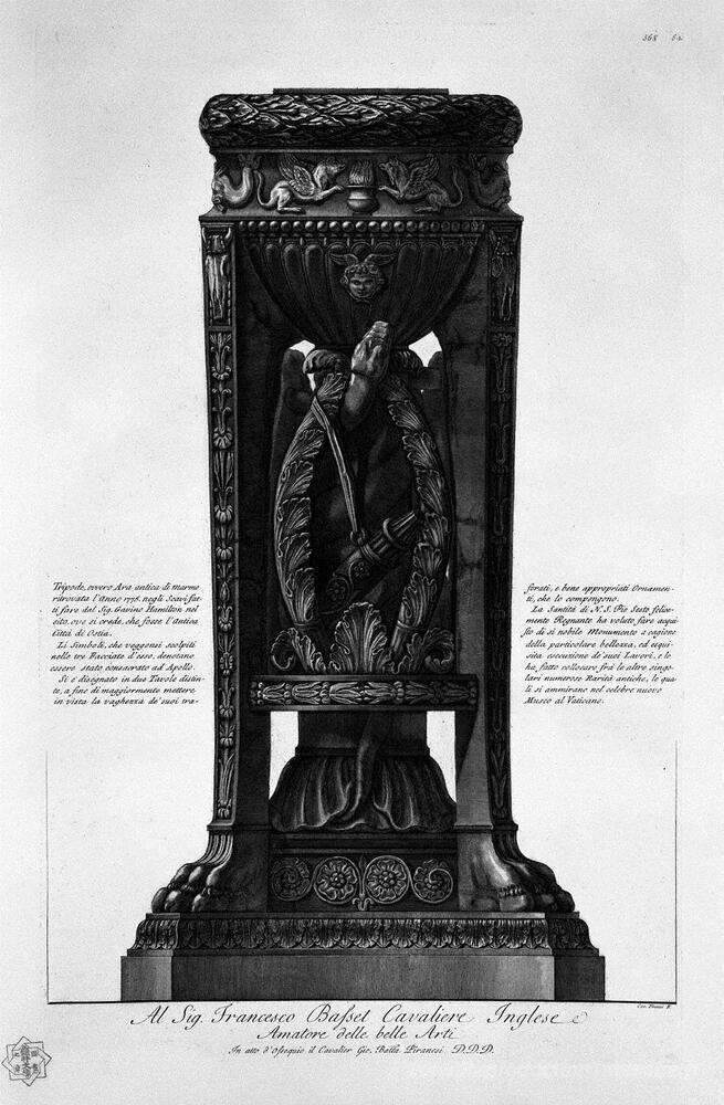 Nous vous proposons une reproduction artisanale sur toile du célèbre tableau 'Trépied ou ancien autel en marbre trouvé à Ostie en 1775 (musées' de Giovanni Battista Piranesi, provenant du Musée de la Reproduction.