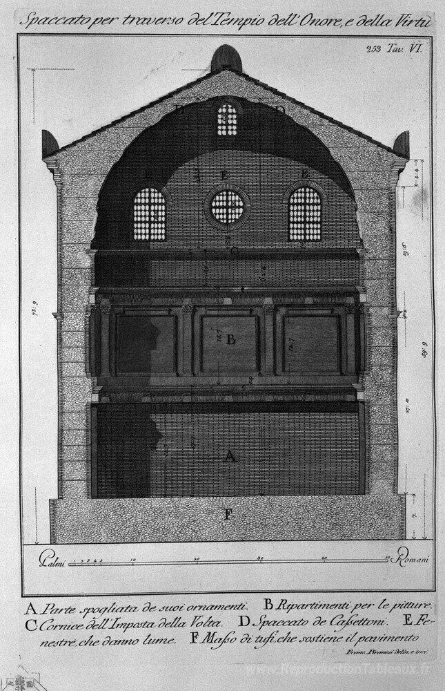 Nous vous proposons une reproduction artisanale sur toile du célèbre tableau 'Transversale transversale au temple d'honneur et de vertu' de Giovanni Battista Piranesi, provenant du Musée de la Reproduction.