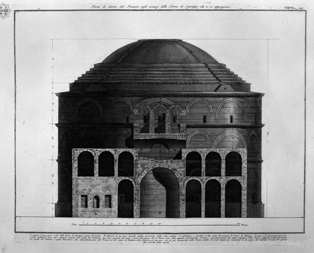 Nous vous proposons une reproduction artisanale sur toile du célèbre tableau 'Une partie de l'arrière du panthéon avec les restes des bains d'' de Giovanni Battista Piranesi, provenant du Musée de la Reproduction.
