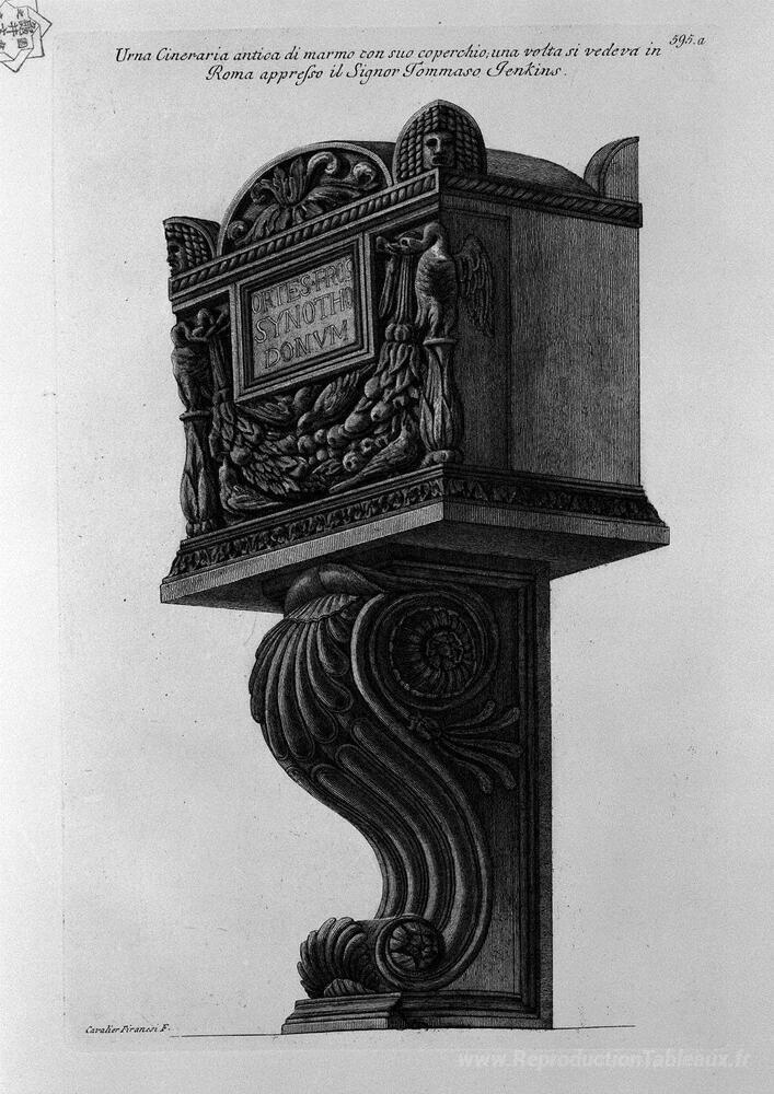 Nous vous proposons une reproduction artisanale sur toile du célèbre tableau 'Urne de marbre avec son couvercle' de Giovanni Battista Piranesi, provenant du Musée de la Reproduction.