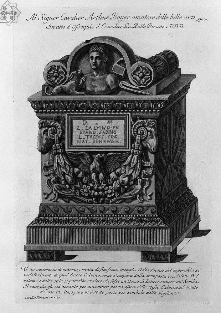 Nous vous proposons une reproduction artisanale sur toile du célèbre tableau 'Urne du marbre Lucius Calvin' de Giovanni Battista Piranesi, provenant du Musée de la Reproduction.