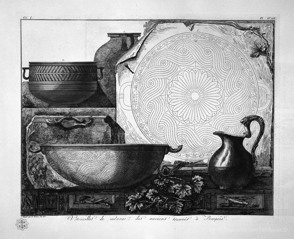Nous vous proposons une reproduction artisanale sur toile du célèbre tableau 'Ustensiles ménagers' de Giovanni Battista Piranesi, provenant du Musée de la Reproduction.