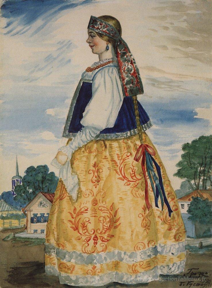 Nous vous proposons une reproduction artisanale sur toile du célèbre tableau 'Varvara. Conception de costumes pour `` The Thunderstor 'de Niko' de Boris Kustodiev, provenant du Musée de la Reproduction.
