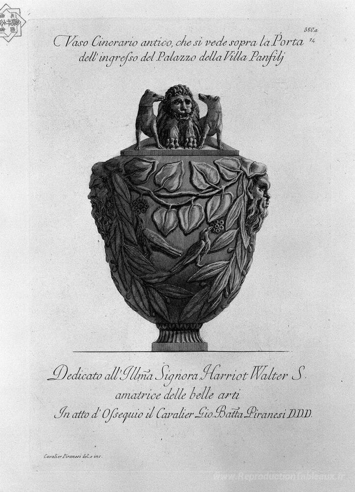 Nous vous proposons une reproduction artisanale sur toile du célèbre tableau 'Vase cinéraire que vous voyez au-dessus de la porte d'entrée du ' de Giovanni Battista Piranesi, provenant du Musée de la Reproduction.