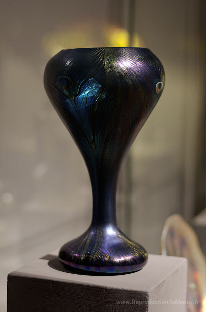 Nous vous proposons une reproduction artisanale sur toile du célèbre tableau 'Vase décoratif de paon' de Louis Comfort Tiffany, provenant du Musée de la Reproduction.