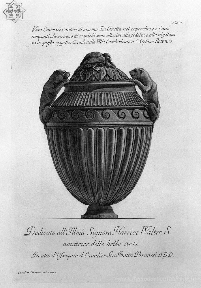 Nous vous proposons une reproduction artisanale sur toile du célèbre tableau 'Vase d'urne en marbre ancien avec des chiens et un hibou volant ' de Giovanni Battista Piranesi, provenant du Musée de la Reproduction.