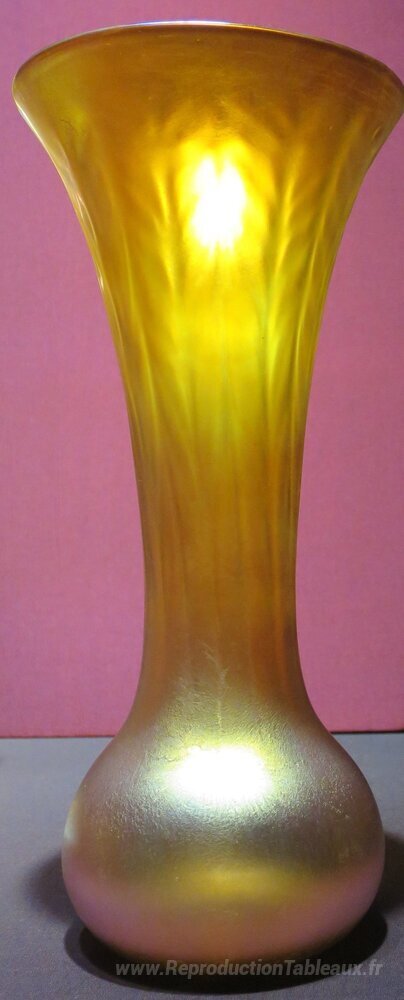 Nous vous proposons une reproduction artisanale sur toile du célèbre tableau 'Vase en verre à long cou' de Louis Comfort Tiffany, provenant du Musée de la Reproduction.