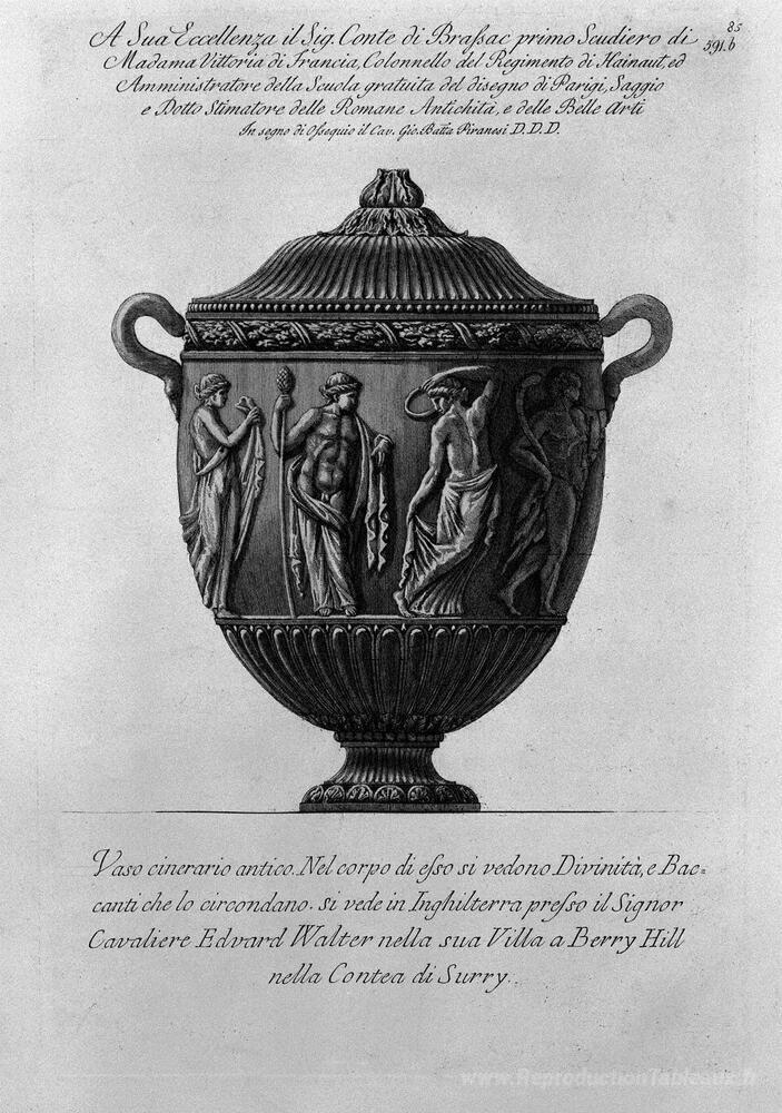 Nous vous proposons une reproduction artisanale sur toile du célèbre tableau 'Vase urn avec des bacchae et divinité' de Giovanni Battista Piranesi, provenant du Musée de la Reproduction.