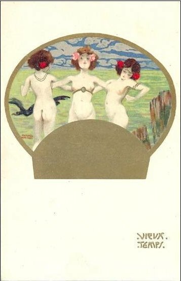 Nous vous proposons une reproduction artisanale sur toile du célèbre tableau 'Vieux temps' de Raphael Kirchner, provenant du Musée de la Reproduction.