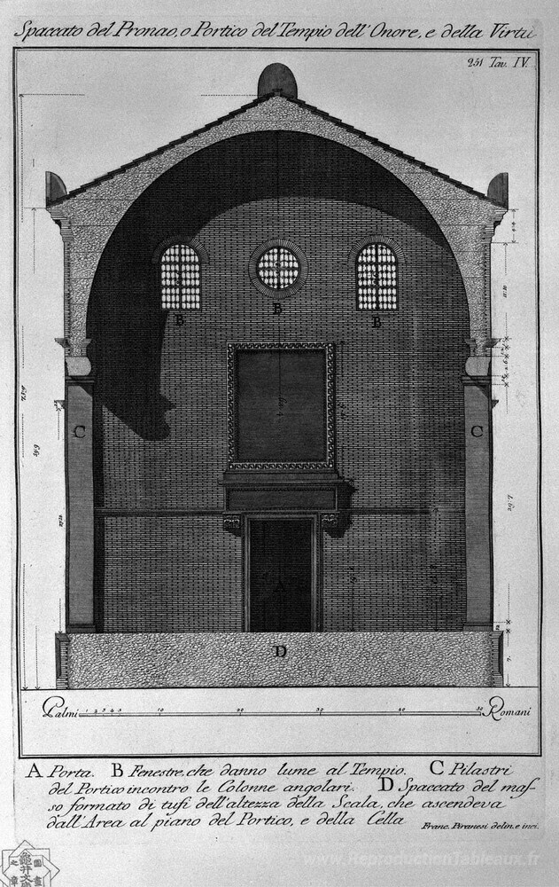 Nous vous proposons une reproduction artisanale sur toile du célèbre tableau 'Vue en coupe des prononos, ou portique du temple d'honneur et de' de Giovanni Battista Piranesi, provenant du Musée de la Reproduction.