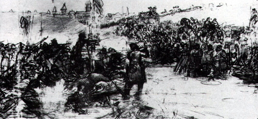 Découvrez la beauté intemporelle des Étude à "la conquête de la Sibérie par Yermak" du maître russe Vasily Surikov, une œuvre qui capture avec brio l'esprit d'une époque tumultueuse. L'artiste, reconnu pour sa capacité à conjurer des émotions profondes à travers des compositions dynamiques et des jeux de lumière, nous plonge dans cet épisode historique avec une intensité saisissante. Surikov, connu pour son style académique et sa technique raffinée, utilise une palette riche et chaleureuse qui transcende le simple tableau pour raconter une véritable histoire.