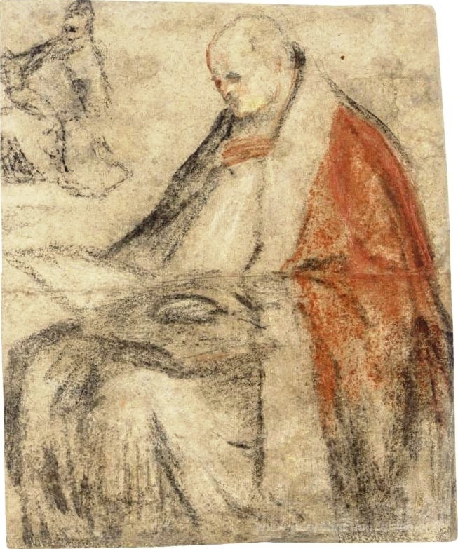 Nous vous proposons une reproduction artisanale sur toile du célèbre tableau 'Étude d'un évêque assis lisant un livre sur ses genoux' de Jacopo Bassano, provenant du Musée de la Reproduction.