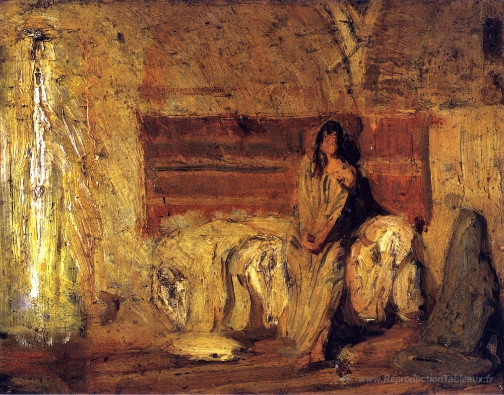 Nous vous proposons une reproduction artisanale sur toile du célèbre tableau 'Étude pour l'annonciation' de Henry Ossawa Tanner, provenant du Musée de la Reproduction.