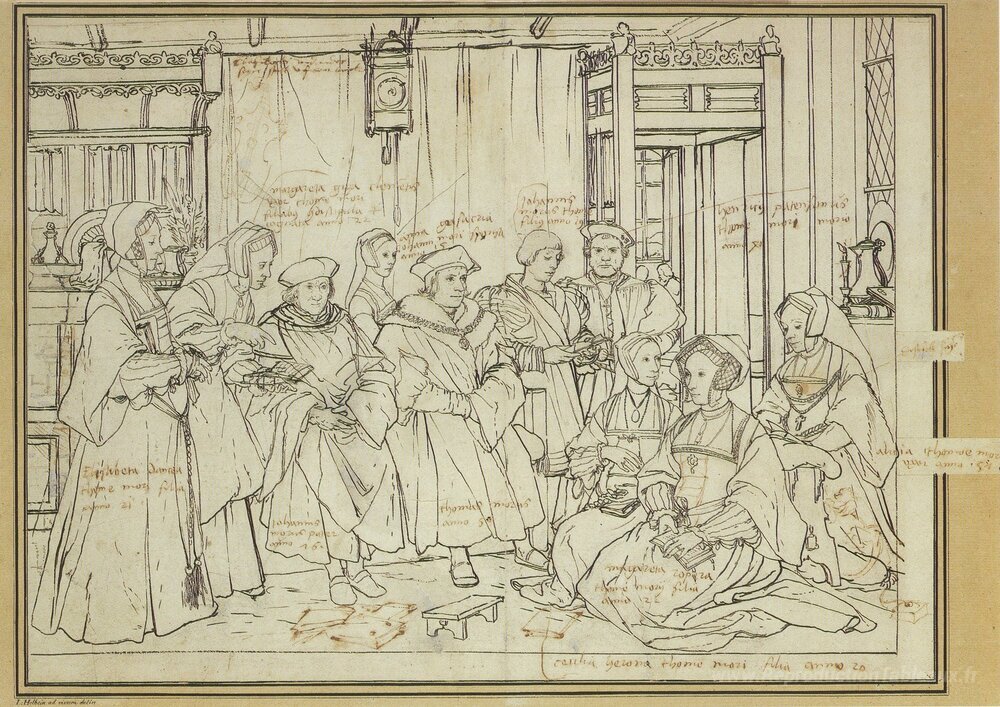 Nous vous proposons une reproduction artisanale sur toile du célèbre tableau 'Étude pour le portrait familial de Thomas More' de Hans Holbein the Younger, provenant du Musée de la Reproduction.