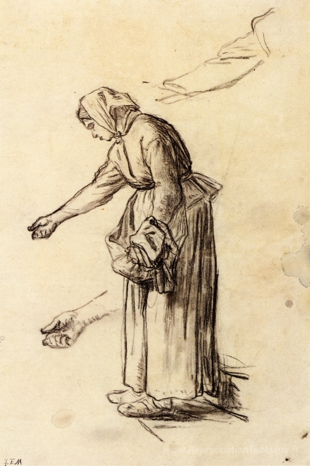 Nous vous proposons une reproduction artisanale sur toile du célèbre tableau 'Étude pour une femme qui nourrit les poulets' de Jean-Francois Millet, provenant du Musée de la Reproduction.